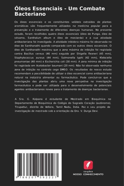 Os óleos essenciais e os constituintes voláteis extraídos de plantas aromáticas são frequentemente utilizados na medicina popular para a prevenção e o tratamento de diferentes doenças humanas. No presente estudo, foram recolhidos quatro óleos essenciais (óleo de Punga, óleo de sésamo, Santhalum album e óleo de mostarda) e a sua atividade antibacteriana foi investigada. A atividade inibidora máxima foi observada no óleo de Santhanathi quando comparado com os outros óleos essenciais. O óleo de Santhanathi mostrou que a zona máxima de inibição foi registada contra Bacillus cereus (46 mm) seguido por Shigella flexneri (45 mm), Staphylococcus aureus (44 mm), Salmonella typhi (42 mm), Klebsiella pneumoniae (40 mm) e Escherichia coli (30 mm). A zona mínima de inibição foi registada em Acetobacter baumani (20 mm). Não foi observada nenhuma zona de inibição no controlo cego DMSO. Os resultados do nosso estudo recomendam a possibilidade de utilizar o óleo essencial como antibacteriano natural na indústria alimentar ou farmacêutica. Pode concluir-se que a investigação das plantas abriu uma nova perspetiva na investigação farmacêutica e pode ser utilizada para o desenvolvimento de potenciais agentes antibacterianos novos para o tratamento de doenças bacterianas.