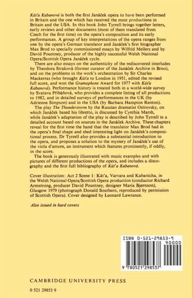 K t'a Kabanov is both the first Jan cek opera to have been performed in Britain and the one which has received the most productions in Britain and the USA. In this book John Tyrrell brings together letters, early reviews and other documents (most of them translated from Czech for the first time) on the opera's composition and its early performances. A group of key interpretations of the opera ranges from one by the opera's German translator and Jan cek's first biographer Max Brod to specially commissioned essays by Wilfrid Mellers and by David Pountney, producer of the highly successful Welsh National Opera/Scottish Opera Jan cek cycle.