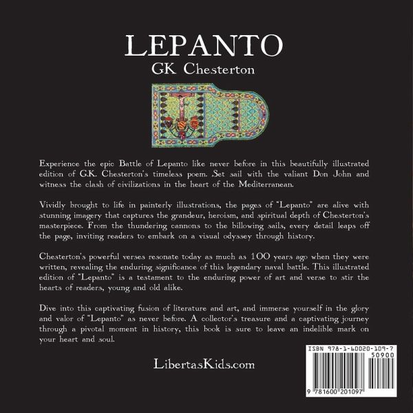 Experience the epic Battle of Lepanto like never before in this beautifully illustrated edition of G.K. Chesterton's timeless poem. Set sail with the valiant Don John and witness the clash of civilizations in the heart of the Mediterranean. Vividly brought to life in painterly illustrations, the pages of Lepanto are alive with stunning imagery that captures the grandeur, heroism, and spiritual depth of Chesterton's masterpiece. From the thundering cannons to the billowing sails, every detail leaps off the page, inviting readers to embark on a visual odyssey through history. Chesterton's powerful verses resonate today as much as 100 years ago when they were written, revealing the enduring significance of this legendary naval battle. This illustrated edition of "Lepanto" is a testament to the enduring power of art and verse to stir the hearts of readers, young and old alike. Dive into this captivating fusion of literature and art, and immerse yourself in the glory and valor of "Lepanto" as never before. A collector's treasure and a captivating journey through a pivotal moment in history, this book is sure to leave an indelible mark on your heart and soul. LibertasKids.com