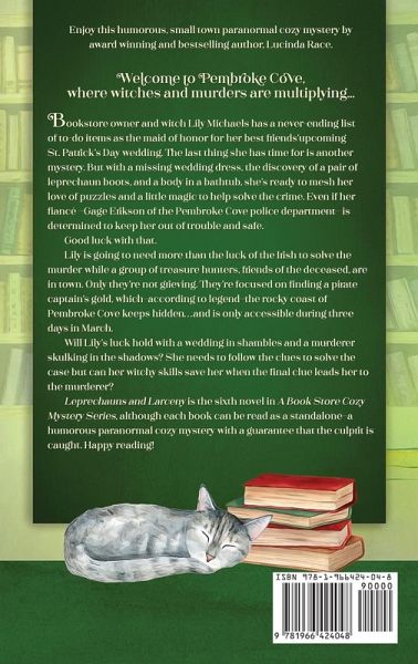 Enjoy this witty paranormal, cozy mystery by award-winning and bestselling author Lucinda Race. Welcome to Pembroke Cove, where witches and murders are multiplying... Bookstore owner and witch Lily Michaels has a never-ending list of to-do items as the maid of honor for her best friends'upcoming St. Patrick's Day wedding. The last thing she has time for is another mystery. But with a missing wedding dress, the discovery of a pair of leprechaun boots, and a body in a bathtub, she's ready to mesh her love of puzzles and a little magic to help solve the crime. Even if her fiancé -Gage Erikson of the Pembroke Cove police department- is determined to keep her out of trouble and safe. Good luck with that. Lily is going to need more than the luck of the Irish to solve the murder while a group of treasure hunters, friends of the deceased, are in town. Only they're not grieving. They're focused on finding a pirate captain's gold, which-according to legend-the rocky coast of Pembroke Cove keeps hidden...and is only accessible during three days in March. Will Lily's luck hold with a wedding in shambles and a murderer skulking in the shadows? She needs to follow the clues to solve the case but can her witchy skills save her when the final clue leads her to the murderer? Leprechauns and Larceny is the sixth novel in A Book Store Cozy Mystery Series, although each book can be read as a standalone-a humorous paranormal cozy mystery with a guarantee that the culprit is caught. Happy reading!