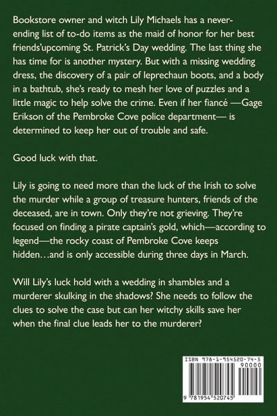 Welcome to Pembroke Cove, where witches and murders are multiplying... Bookstore owner and witch Lily Michaels has a never-ending list of to-do items as the maid of honor for her best friends'upcoming St. Patrick's Day wedding. The last thing she has time for is another mystery. But with a missing wedding dress, the discovery of a pair of leprechaun boots, and a body in a bathtub, she's ready to mesh her love of puzzles and a little magic to help solve the crime. Even if her fiancé -Gage Erikson of the Pembroke Cove police department- is determined to keep her out of trouble and safe. Good luck with that. Lily is going to need more than the luck of the Irish to solve the murder while a group of treasure hunters, friends of the deceased, are in town. Only they're not grieving. They're focused on finding a pirate captain's gold, which-according to legend-the rocky coast of Pembroke Cove keeps hidden...and is only accessible during three days in March. Will Lily's luck hold with a wedding in shambles and a murderer skulking in the shadows? She needs to follow the clues to solve the case but can her witchy skills save her when the final clue leads her to the murderer? Leprechauns and Larceny is the sixth novel in A Book Store Cozy Mystery Series, although each book can be read as a standalone-a sweet and clean cozy mystery with a guarantee that the culprit is caught. Happy reading!
