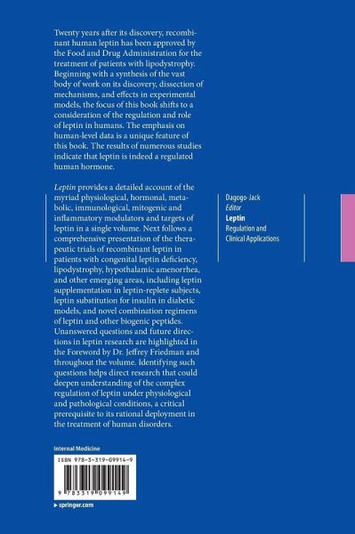 Discovery of leptin and elucidation of leptin gene expression.- Leptin receptors and mechanism of action.- Leptin interaction with brain orexigenic and anorexigenic pathways.- Measurement of circulating leptin and soluble leptin receptors.- Physiological and hormonal factors that influence leptin production.- Leptin, obesity and leptin resistance.- Leptin and intermediary metabolism: Focus on glucoregulation and lipid metabolism.- Leptin in acute stress.- Leptin and the kidney.- Leptin, immune function, and inflammation.- Leptin and bone.- Leptin, cell cycle, and cancer.- Leptin, the autonomic nervous system, and hypertension.- Dynamic leptin secretion in obesity and diabetes.- Leptin therapy of congenital leptin deficiency.- Leptin therapy in people with normal leptin gene.- Leptin therapy in patients with lipodystrophy and syndromic insulin resistance.- Leptin therapy in women with hypothalamic amenorrhea.- Leptin therapy as a substitute for insulin replacement in experimental models of diabetes: Clinical implications in humans.- Novel combinatorial therapies involving leptin: Opportunities for mechanistic advances and therapeutic translation in human diseases.
