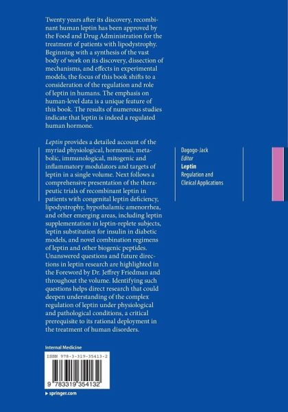 Discovery of leptin and elucidation of leptin gene expression.- Leptin receptors and mechanism of action.- Leptin interaction with brain orexigenic and anorexigenic pathways.- Measurement of circulating leptin and soluble leptin receptors.- Physiological and hormonal factors that influence leptin production.- Leptin, obesity and leptin resistance.- Leptin and intermediary metabolism: Focus on glucoregulation and lipid metabolism.- Leptin in acute stress.- Leptin and the kidney.- Leptin, immune function, and inflammation.- Leptin and bone.- Leptin, cell cycle, and cancer.- Leptin, the autonomic nervous system, and hypertension.- Dynamic leptin secretion in obesity and diabetes.- Leptin therapy of congenital leptin deficiency.- Leptin therapy in people with normal leptin gene.- Leptin therapy in patients with lipodystrophy and syndromic insulin resistance.- Leptin therapy in women with hypothalamic amenorrhea.- Leptin therapy as a substitute for insulin replacement in experimental models of diabetes: Clinical implications in humans.- Novel combinatorial therapies involving leptin: Opportunities for mechanistic advances and therapeutic translation in human diseases.