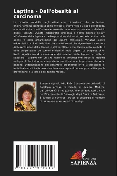 Le ricerche condotte negli ultimi anni dimostrano che la leptina, originariamente identificata come molecola chiave nello sviluppo dell'obesità, è una citochina multifunzionale coinvolta in numerosi processi cellulari in diversi tessuti. Questa monografia presenta i nostri risultati relativi all'influenza della leptina e dell'espressione del recettore della leptina nella genesi e nella progressione del cancro colorettale. Vengono inoltre evidenziati i risultati delle ricerche di altri autori che riguardano il carattere dell'espressione della leptina e del recettore della leptina nella crescita e nella progressione dei tumori maligni di molti organi. La scoperta di un livello significativo di espressione dei recettori della leptina permette di separare i pazienti con un alto rischio di progressione verso la malattia maligna, il che è di grande importanza per il trattamento post-operatorio dei pazienti. L'identificazione dei parametri prognostici offre la possibilità di individualizzare il trattamento antitumorale, aprendo nuove prospettive per la prevenzione e la terapia dei tumori maligni.