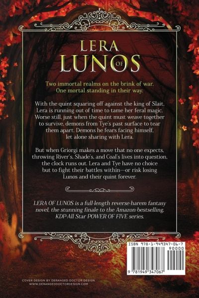 Two immortal realms on brink of war. One mortal standing in their way. With the quint squaring off against the king of Slait, Lera is running out of time to tame her feral magic. Worse still, just when the quint must weave together to survive, demons from Tye’s past surface to tear them apart. Demons he fears facing himself, let alone sharing with Lera. But when Griorgi makes a move that no one expects, throwing River’s, Shade’s, and Coal’s lives into question, the clock runs out. Lera and Tye have no choice but to fight their battles within—or risk losing Lunos and their quint forever. LERA OF LUNOS is a full-length reverse-harem fantasy novel, the stunning finale to the Amazon-bestselling, KDP-All Star POWER OF FIVE series.