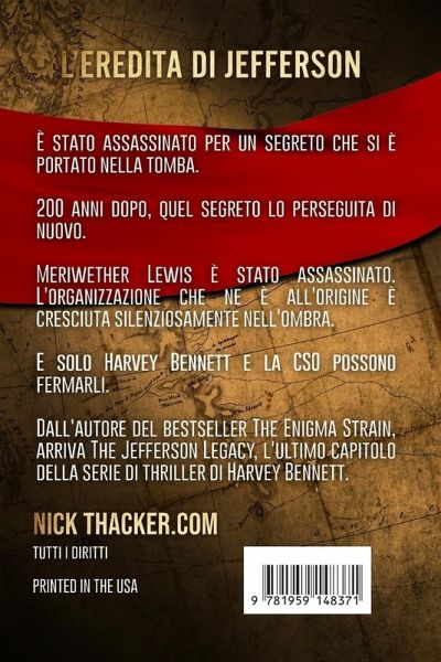 È stato assassinato per un segreto che si è portato nella tomba. 200 anni dopo, quel segreto lo perseguita di nuovo. Meriwether Lewis è stato assassinato. L'organizzazione che ne è all'origine è cresciuta silenziosamente nell'ombra. E solo Harvey Bennett e la CSO possono fermarli. Harvey "Ben" Bennett è tornato, e non è solo. La sua nuova squadra - le Operazioni Speciali Civili - sta dando gli ultimi ritocchi alla loro nuova sede quando riceve una telefonata: C'è stato un omicidio. E sulla sua scia è stato rubato un manufatto apparentemente insignificante. Ben e la sua compagnia si recano a Filadelfia per indagare sulla morte e vengono accolti da una moderna Società Filosofica Americana - e scoprono che stanno proteggendo un segreto mortale che risale alla storia fino agli stessi Padri Fondatori. Qual è il segreto per cui Meriwether Lewis è morto? E perché oggi molti sono disposti a uccidere per esso? Dall'autore del bestseller The Enigma Strain, arriva The Jefferson Legacy, l'ultimo capitolo della serie di thriller di Harvey Bennett. Tradotto con www.DeepL.com/Translator (versione gratuita)