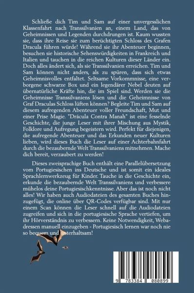 Schließe dich Tim und Sam auf einer unvergesslichen Klassenfahrt nach Transsilvanien an, einem Land, das von Geheimnissen und Legenden durchdrungen ist. Kaum wussten sie, dass ihre Reise sie zum berüchtigten Schloss des Grafen Dracula führen würde! Während sie ihr Abenteuer beginnen, besuchen sie historische Sehenswürdigkeiten in Frankreich und Italien und tauchen in die reichen Kulturen dieser Länder ein. Doch alles ändert sich, als sie Transsilvanien erreichen. Tim und Sam können nicht anders, als zu spüren, dass sich etwas Geheimnisvolles entfaltet. Seltsame Vorkommnisse, eine verborgene schwarze Box und ein legendärer Nebel deuten auf übernatürliche Kräfte hin, die im Spiel sind. Werden sie die Geheimnisse Transsilvaniens lösen und die Geheimnisse von Graf Draculas Schloss lüften können? Begleite Tim und Sam auf diesem aufregenden Abenteuer voller Freundschaft, Mut und einer Prise Magie. "Drácula Contra Manah" ist eine fesselnde Geschichte, die junge Leser mit ihrer Mischung aus Mystik, Folklore und Aufregung begeistern wird. Perfekt für diejenigen, die aufregende Abenteuer und das Erkunden neuer Kulturen lieben, wird dieses Buch die Leser auf einer Achterbahnfahrt durch die bezaubernde Welt Transsilvaniens mitnehmen. Mache dich bereit, verzaubert zu werden!Dieses zweisprachige Buch enthält eine Parallelübersetzung vom Portugiesischen ins Deutsche und ist somit ein ideales Sprachlernwerkzeug für Kinder. Tauche in die Geschichte ein, erkunde die bezaubernde Welt Transsilvaniens und verbessere mühelos deine Portugiesischkenntnisse. Aber das ist noch nicht alles! Wir haben auch Audiodateien des gesamten Buches hinzugefügt, die online über QR-Codes verfügbar sind. Mit nur einem Scan können die Leser schnell auf die Audiodateien zugreifen und sich in die portugiesische Sprache vertiefen, um ihr Hörverständnis zu verbessern. Keine Notwendigkeit, Webadressen manuell einzugeben - Portugiesisch lernen war noch nie so bequem und unterhaltsam!