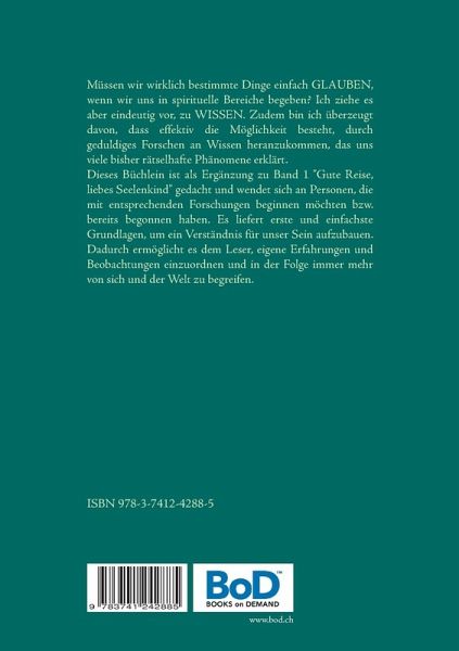 Müssen wir wirklich bestimmte Dinge einfach GLAUBEN, wenn wir uns in spirituelle Bereiche begeben? Ich ziehe es aber eindeutig vor, zu WISSEN. Zudem bin ich überzeugt davon, dass effektiv die Möglichkeit besteht, durch geduldiges Forschen an Wissen heranzukommen, das uns viele bisher rätselhafte Phänomene erklärt.Dieses Büchlein ist als Ergänzung zu Band 1 "Gute Reise, liebes Seelenkind" gedacht und wendet sich an Personen, die mit entsprechenden Forschungen beginnen möchten bzw. bereits begonnen haben. Es liefert erste und einfachste Grundlagen, um ein Verständnis für unser Sein aufzubauen. Dadurch ermöglicht es dem Leser, eigene Erfahrungen und Beobachtungen einzuordnen und in der Folge immer mehr von sich und der Welt zu begreifen.