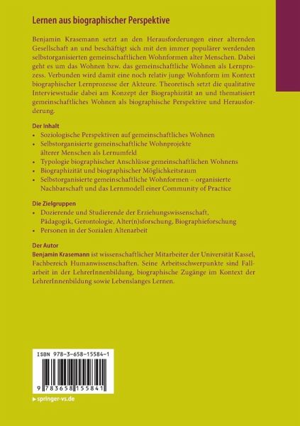 Benjamin Krasemann setzt an den Herausforderungen einer alternden Gesellschaft an und beschäftigt sich mit den immer populärer werdenden selbstorganisierten gemeinschaftlichen Wohnformen alter Menschen. Dabei geht es um das Wohnen bzw. das gemeinschaftliche Wohnen als Lernprozess. Verbunden wird damit eine noch relativ junge Wohnform im Kontext biographischer Lernprozesse der Akteure. Theoretisch setzt die qualitative Interviewstudie dabei am Konzept der Biographizität an und thematisiert gemeinschaftliches Wohnen als biographische Perspektive und Herausforderung.