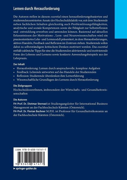Die Autoren stellen in diesem essential einen herausforderungsbasierten und studierendenzentrierten Ansatz der Hochschuldidaktik vor, mit dem Studierende neben fachlichen Inhalten gleichzeitig auch Problemlösungsfähigkeiten, analytische und soziale Kompetenzen sowie die Fähigkeit zur Selbstreflexion und -entwicklung erwerben und anwenden können. Basierend auf aktuellen Erkenntnissen der Motivations-, Lern- und Neurowissenschaften wird ein praxisorientiertes Lehr- und Lernmodell präsentiert, in dem Herausforderungen, aktives Handeln, Feedback und Reflexion im Zentrum stehen. Studierende sollen dabei zu selbstständigem kritischem Denken motiviert werden. Das essential enthält zahlreiche Tipps für eine die Studierenden aktivierende und motivierende Form des Lehrens und Lernens sowie konkrete Anwendungsbeispiele aus der Lehrpraxis.