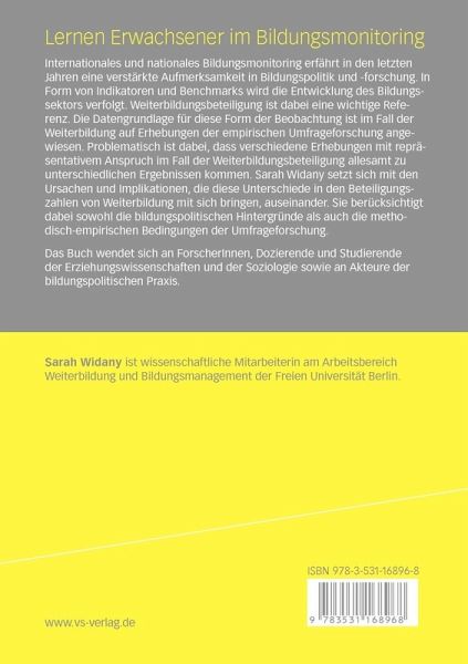 Internationales und nationales Bildungsmonitoring erfährt in den letzten Jahren eine verstärkte Aufmerksamkeit in Bildungspolitik und -forschung. In Form von Indikatoren und Benchmarks wird die Entwicklung des Bildungssektors verfolgt. Weiterbildungsbeteiligung ist dabei eine wichtige Referenz. Die Datengrundlage für diese Form der Beobachtung ist im Fall der Weiterbildung auf Erhebungen der empirischen Umfrageforschung angewiesen. Problematisch ist dabei, dass verschiedene Erhebungen mit repräsentativem Anspruch im Fall der Weiterbildungsbeteiligung allesamt zu unterschiedlichen Ergebnissen kommen. Sarah Widany setzt sich mit den Ursachen und Implikationen, die diese Unterschiede in den Beteiligungszahlen von Weiterbildung mit sich bringen, auseinander. Sie berücksichtigt dabei sowohl die bildungspolitischen Hintergründe als auch die methodisch-empirischen Bedingungen der Umfrageforschung.