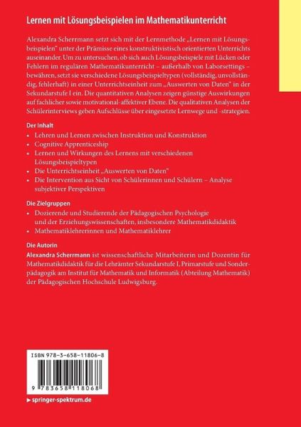 Alexandra Scherrmann setzt sich mit der Lernmethode "Lernen mit Lösungsbeispielen" unter der Prämisse eines konstruktivistisch orientierten Unterrichts auseinander. Um zu untersuchen, ob sich auch Lösungsbeispiele mit Lücken oder Fehlern im regulären Mathematikunterricht - außerhalb von Laborsettings - bewähren, setzt sie verschiedene Lösungsbeispieltypen (vollständig, unvollständig, fehlerhaft) in einer Unterrichtseinheit zum "Auswerten von Daten" in der Sekundarstufe I ein. Die quantitativen Analysen zeigen günstige Auswirkungen auf fachlicher sowie motivational-affektiver Ebene. Die qualitativen Analysen der Schülerinterviews geben Aufschlüsse über eingesetzte Lernwege und -strategien.