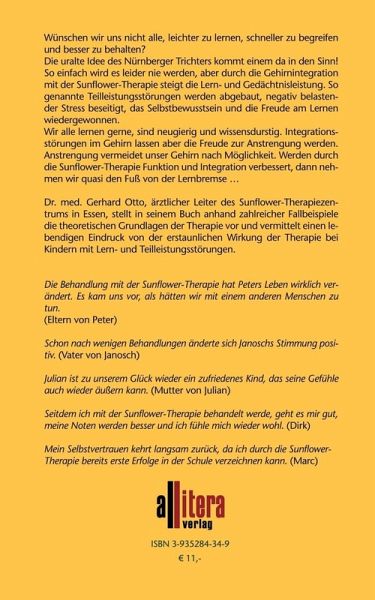 Dr. med. Gerhard Otto, ärztlicher Leiter des Sunflower-Therapiezentrums in Essen, stellt in seinem Buch anhand zahlreicher Fallbeispiele die theoretischen Grundlagen der Therapie vor und vermittelt einen lebendigen Eindruck von der erstaunlichen Wirkung der Therapie bei Kindern mit Lern- und Teilleistungsstörungen.