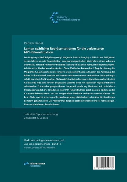 Die Magnetpartikelbildgebung (engl. Magnetic Particle Imaging - MPI) ist ein bildgebendes Verfahren, das die Konzentration superparamagnetischen Materials in einem Volumen quantitativ darstellt. Aktuell wird das Bild aus der gemessenen, verrauschten Spannung mittels iterativer Methoden rekonstruiert. Diese Methoden bieten durch Regularisierung die Möglichkeit, das Rauschen zu verringern. Das geschieht aber auf Kosten der Auflösung der Bilder. In diesem Werk wird die MPI-Rekonstruktion um einen zusätzlichen Entrauschungsschritt erweitert. Dafür wird das Bild zunächst mit dem Kaczmarz-Algorithmus rekonstruiert. Auf das Bild wird eine für MPI angepasste Variante eines mit spärlichen Repräsentationen arbeitenden Entrauschungsalgorithmus (expected patch log likelihood mit spärlichem Prior) angewendet. Die Simulation einer MPI-Rekonstruktion zeigt, dass die Bilder aus der Kaczmarz-Rekonstruktion mit der vorgestellten Methode verbessert werden können. Als beste Wahl erweist sich ein auf Beispielen gelerntes Wörterbuch, das über die Iterationen konstant gehalten wird. Der Algorithmus zeigt ein stabiles Verhalten und ist robust gegenüber verschiedenen Rauschniveaus.