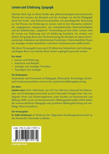 Günther Buck legt in dieser Studie eine phänomenologisch-hermeneutische Theorie des Lernens, des Beispiels und der Analogie vor, die für Pädagogik sowie für Sozial- und Kulturwissenschaften von grundlegender Bedeutung ist. Der Prozess der Erfahrung im Lernen wird in drei Momenten entfaltet: der epagogischen Gangstruktur, der antizipatorischen Horizonthaftigkeit und der dialektischen, "negativen" Umwendung auf sich selbst. Lernen wird als Lernen aus Erfahrung und als Erfahrung kenntlich. Im zweiten und dritten Teil gelingt Buck eine Neubestimmung des Beispiels in seinen hermeneutischen, bildenden und didaktischen Funktionen. Unterschiedliche Typen der Analogie werden identifiziert und deren Funktionsweisen differenziert.
