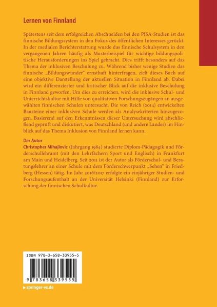 Spätestens seit dem erfolgreichen Abschneiden bei den PISA-Studien ist das finnische Bildungssystem in den Fokus des öffentlichen Interesses gerückt. In der medialen Berichterstattung wurde das finnische Schulsystem in den vergangenen Jahren häufig als Musterbeispiel für wichtige bildungspolitische Herausforderungen ins Spiel gebracht. Dies trifft besonders auf das Thema der inklusiven Beschulung zu. Während bisher wenige Studien das finnische "Bildungswunder" ernsthaft hinterfragen, zielt dieses Buch auf eine objektive Darstellung der aktuellen Situation in Finnland ab. Dabei wird ein differenzierter und kritischer Blick auf die inklusive Beschulung in Finnland geworfen. Um dies zu erreichen, wird die inklusive Schul- und Unterrichtskultur mit Hilfe von qualitativen Forschungszugängen an ausgewählten finnischen Schulen untersucht. Die von Reich (2014) entwickelten Bausteine einer inklusiven Schule werden als Analysekriterien hinzugezogen. Basierend auf den Erkenntnissendieser Untersuchung wird abschließend geprüft und diskutiert, was Deutschland (und andere Länder) im Hinblick auf das Thema Inklusion von Finnland lernen kann.