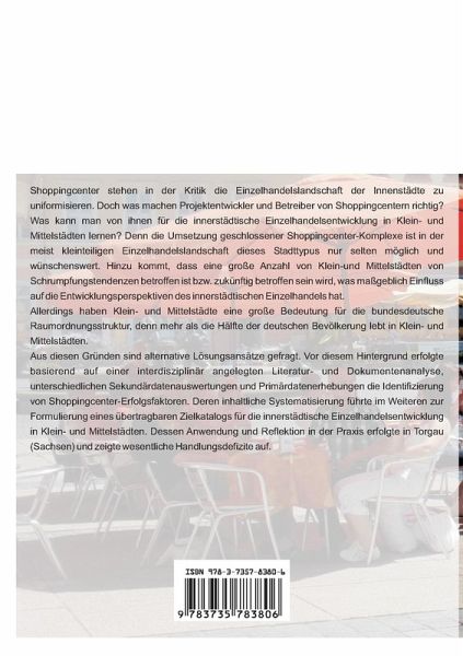 Shoppingcenter stehen immer wieder in der Kritik die Einzelhandelslandschaft der Innenstädte zu uniformisieren. Doch die Nachfrage nach innerstädtischen Shoppingcenterprojekten ist groß, denn rund 70% aller Projektentwicklungen werden an zentralen Standorten realisiert. Dabei stehen aktuell auch Klein- und Mittelstädte verstärkt im Fokus der Projektentwickler und Investoren. Was also macht das Format des Shoppingcenters so attraktiv? Und was kann man daraus für die notwendige innerstädtische Einzelhandelsentwicklung in Klein- und Mittelstädten lernen? Denn Klein- und Mittelstädte bestimmen als regionale Wirtschafts- und Arbeitsmarktzentren die wirtschaftliche, raumstrukturelle und gesellschaftliche Entwicklung Deutschlands entscheidend mit.Doch das Format des klassischen Shoppingcenters (mit einer Verkaufsfläche ab ca. 10 000 m²) ist i. d. R. nicht ohne Weiteres städtebaulich, funktional verträglich sowie wirtschaftlich erfolgreich auf Klein- und Mittelstädte übertragbar. Aus diesem Grund bedarf es alternativer Lösungsansätze. Die vorliegende Arbeit verfolgt dementsprechend das Ziel: Basierend auf einem abgeleiteten Shoppingcenter-Erfolgsfaktorenset einen Zielkatalog für die innerstädtische Einzelhandelsentwicklung abzuleiten.