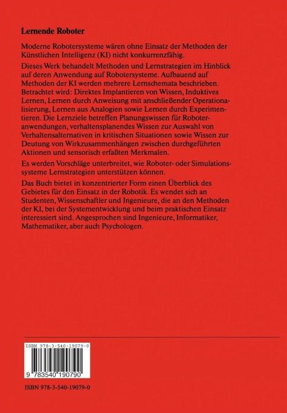 Lernende Roboter behandelt Methoden und Lernstrategien der Künstlichen Intelligenz (KI) im Hinblick auf deren Anwendungen in der Robotik. Mehrere Lernschemata werden beschrieben. Lernen wird als das Hinzufügen neuen Wissens zu bestehendem Grundwissen und deren Wechselwirkung verstanden. Verschiedene Formen der Wissensaneignung werden besprochen. Die Lernziele entsprechen dem breiten Spektrum der Anforderungen; der behandelte Stoff reicht vom direkt implementierten Wissen bis hin zur Deutung von Wirkzusammenhängen zwischen durchgeführten Aktionen und sensorisch erfaßten Merkmalen. Ziel des Buches ist eine Diskussion des Einsatzes von Lernstrategien für zukünftige, intelligente und autonome Robotersysteme. Es bietet in konzentrierter Form einen Überblick über das Gebiet, aufbereitet für den Einsatz in der Robotik.