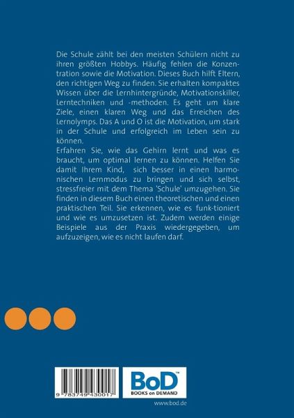 Die Schule zählt bei den meisten Schülern nicht zu ihren größten Hobbys. Häufig fehlen die Konzentration sowie die Motivation. Dieses Buch hilft Eltern, den richtigen Weg zu finden. Sie erhalten kompaktes Wissen über die Lernhintergründe, Motivationskiller, Lerntechniken und -methoden. Es geht um klare Ziele, einen klaren Weg und das Erreichen des Lernolymps. Das A und O ist die Motivation, um stark in der Schule und erfolgreich im Leben sein zu können.