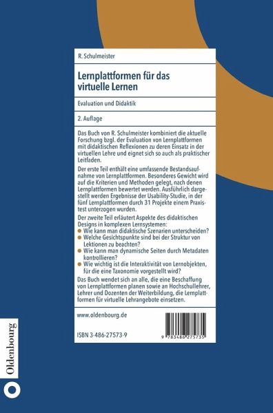 Das Buch von R. Schulmeister kombiniert die aktuelle Forschung zur Evaluation von Lernplattformen mit didaktischen Reflexionen zu deren Einsatz in der virtuellen Lehre und eignet sich so auch als praktischer Leitfaden. Der erste Teil berichtet über eine umfassende Bestandsaufnahme von Lernplattformen.