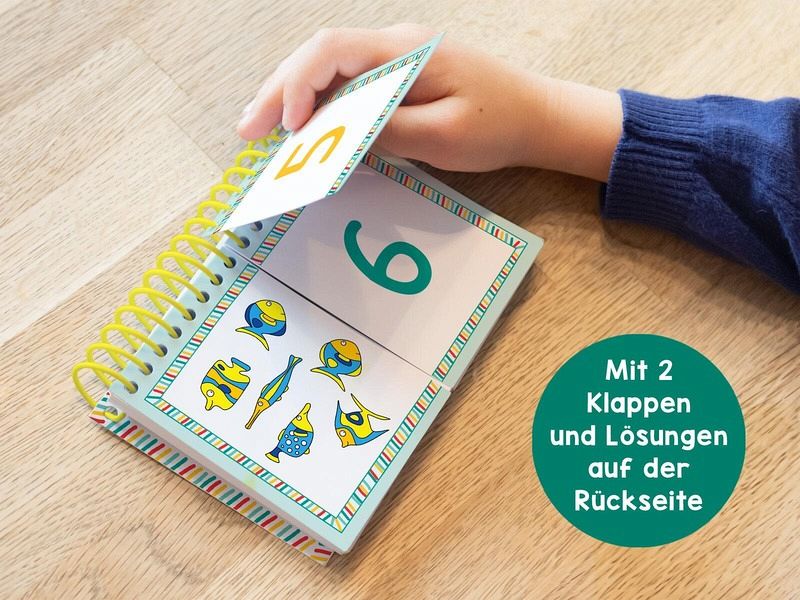 Was gehört zusammen? Immer 2 Klappen ergeben die Lösung. Aber welche Zahl passt zu welchem Bild? Die Rückseite zeigt, ob man richtig liegt. So lernen Kinder spielerisch Zahlen und Mengen kennen.