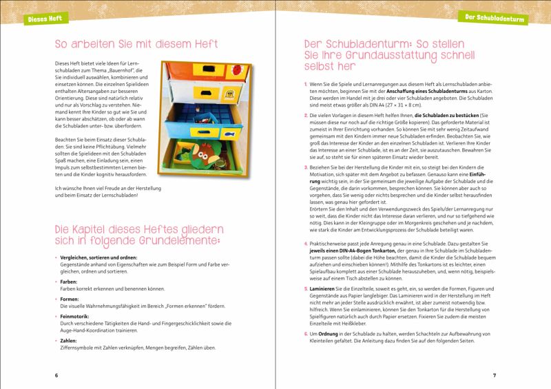 25 Lernangebote für Kinder von zwei bis sechs Jahren: die das Leben auf dem Bauernhof, die Tiere und die Landwirtschaft mithilfe von Formen, Farben, Zahlen und Reihenfolgen kennenlernen. Auf spielerische Art und Weise werden durch Sortieren, Vergleichen und Klassifizieren Konzentration, Wahrnehmung, Feinmotorik und Abstraktion gefördert. Verpackt ist dies alles in dem praktischen Konzept der Lernschublade - eine originelle und kreative Idee für selbstbestimmtes und selbstständiges Lernen.