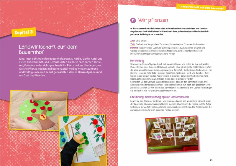In diesem Heft finden ErzieherInnen und Tageseltern viele Ideen für Lernschubladen zu Landwirtschaft und Bauernhof. Schnell einsetzbar und leicht umzusetzen für Kindertagespflege, Tagesmutter, Krippe und Kita.
