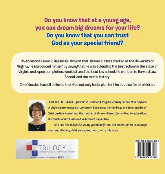 Do you know that at a young age, you can dream big dreams for your life? Do you know that you can trust God as your special friend? Chief Justice Leroy R. Hassell Sr. did just that. Before classes started at the University of Virginia, he introduced himself by saying that he was attending the best school in the state of Virginia and, upon completion, would attend the best law school. He went on to Harvard Law School, and the rest is history! Chief Justice Hassell believed that God not only had a plan for him but also for all children.