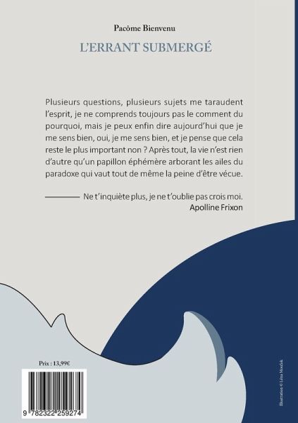 Plusieurs questions, plusieurs sujets me taraudent l'esprit. Je ne comprends toujours pas le comment du pourquoi, mais je peux enfin dire aujourd'hui que je me sens bien, et je pense que cela reste le plus important non? Après tout, la vie n'est rien d'autre qu'un papillon éphémère arborant les ailes du paradoxe qui vaut tout de même la peine d'être vécue._____ Ne t'inquiète plus, je ne t'oublie pas crois moi. Apolline Frixon.
