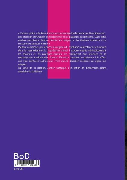 « L'erreur spirite » de René Guénon est un ouvrage fondamental qui décortique avec une précision chirurgicale les fondements et les pratiques du spiritisme. Dans cette analyse percutante, Guénon dévoile les dangers et les illusions inhérents à ce mouvement spirituel moderne. L'auteur commence par retracer les origines du spiritisme, remontant à ses racines dans le mesmérisme et le magnétisme animal. Il expose ensuite méthodiquement les théories et les pratiques spirites, les confrontant aux principes de la métaphysique traditionnelle. Guénon démontre comment le spiritisme, loin d'être une voie spirituelle authentique, n'est qu'une déviation moderne qui égare ses adeptes. Au coeur de sa critique, Guénon s'attaque à la notion de médiumnité, pierre angulaire du spiritisme. Il explique comment les phénomènes psychiques observés lors des séances spirites peuvent être expliqués par des causes naturelles, sans recourir à l'intervention des « esprits des morts ». Cette analyse s'inscrit parfaitement dans la catégorie des « Études ésotériques » sur les plateformes de vente en ligne. L'ouvrage aborde également les dangers psychiques et spirituels auxquels s'exposent les pratiquants du spiritisme. Guénon met en garde contre les risques de déséquilibre mental et de possession psychique, offrant ainsi une perspective critique essentielle pour quiconque s'intéresse à l'« Occultisme et paranormal ». « L'erreur spirite » ne se contente pas de critiquer ; il propose une alternative en présentant les principes de la spiritualité traditionnelle. Guénon oppose à l'illusion spirite la sagesse des traditions orientales et occidentales, offrant ainsi une voie de « Développement personnel et spirituel » authentique.