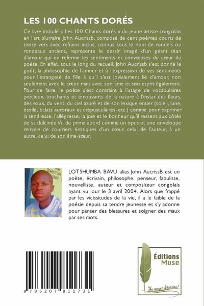 Ce livre intitulé « Les 100 Chants dorés » du jeune artiste congolais en l'art plumaire John Aucrissb, composé de cent poèmes courts de treize vers avec refrains inclus, connus sous le nom de rondels ou rondeaux anciens, représente le dessin imagé d'un géant titan d'amour qui en referme les sentiments et convoitises du coeur du poète. En effet, tout le long du recueil, John Aucrissb s'est donné le goût, la philosophie de l'amour et à l'expression de ses sentiments pour l'étrangeté de fille à qu'il s'est jovialement lié d'amour, non seulement avec le coeur, mais avec son âme et son esprit également. Pour ce faire, le poète s'est contraint à l'usage de vocabulaires précieux, touchants et émouvants de la nature à l'instar des fleurs, des eaux, du vent, du ciel azuré et de son lexique entier (soleil, lune, étoile, éclats auroraux et crépusculaires, etc.) comme pour exprimer la tendresse, l'allégresse, la joie et le bonheur qu'il ressent aux côtés de sa dulcinée.Vu de prime abord comme un opus et une enveloppe remplie de courriers érotiques d'un coeur, celui de l'auteur, à un autre, celui de son âme-soeur.