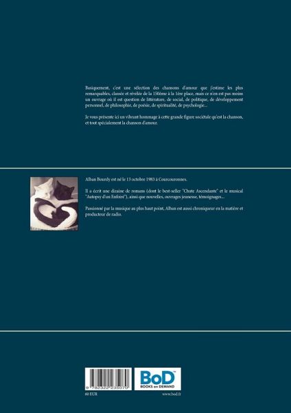 Basiquement, c'est une sélection des chansons d'amour que j'estime les plus remarquables, classée et révélée de la 150ème à la 1ère place, mais ce n'en est pas moins un ouvrage où il est question de littérature, de social, de politique, de développement personnel, de philosophie, de poésie, de spiritualité, de psychologie...