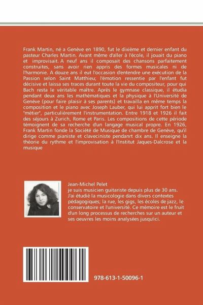 Frank Martin, né a Genève en 1890, fut le dixième et dernier enfant du pasteur Charles Martin. Avant même d'aller à l'école, il jouait du piano et improvisait. A neuf ans il composait des chansons parfaitement construites, sans avoir rien appris des formes musicales ni de l'harmonie. A douze ans il eut l'occasion d'entendre une exécution de la Passion selon Saint Matthieu; l'émotion ressentie par l'enfant fut décisive et laissa ses traces durant toute la vie du compositeur, pour qui Bach resta le véritable maître. Après le gymnase classique, il étudia pendant deux ans les mathématiques et la physique à l'Université de Genève (pour faire plaisir à ses parents) et travailla en même temps la composition et le piano avec Joseph Lauber, qui lui apprit fort bien le "métier", particulièrement l'instrumentation. Entre 1918 et 1926 il fait des séjours à Zurich, Rome et Paris. Les compositions de cette période témoignent de sa recherche d'un langage musical propre. En 1926, Frank Martin fonde la Société de Musique de chambre de Genève, qu'il dirige comme pianiste et claveciniste pendanrt dix ans. Il enseigne la théorie du rythme et l'improvisation à l'Institut Jaques-Dalcrose et la musique