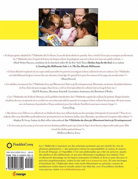 Un best-seller du grand auteur américain, Sean Covey : Pour l'estime de soi, la motivation, et la réussite des enfants Éveil et éducation: Dans Les 7 habitudes des enfants heureux, Sean Covey raconte des histoires joyeusement illustrées pour partager une philosophie et une pédagogie positive qui ont fait leurs preuves dans l'éveil et l'éducation des jeunes enfants de sa famille. Vivre dans le bonheur: Les amis des Sept Chênes ne s'ennuient jamais. Que ce soit en chantant accompagné de l'harmonica de Pic-Pic "Pokey" Hérisson or en jouant au football avec Gambado "Jumper" Lapin, tout le monde s'amuse en apprenant des astuces de la vie quotidienne pour l'estime de soi, la motivation, et la réussite. Ces sept histoires montrent comment la pratique des 7 habitudes permet aux enfants de devenir très doués et à la communauté des Sept Chênes de vivre dans le bonheur. Pour les enfants: Ce livre est destiné aux enfants qui veulent être super heureux. A la découverte de la façon de prendre sa vie en main et de l'importance de l'équilibre, les amis des Sept Chênes vivent d'innombrables aventures et apprennent ce qui fait le bonheur de chaque enfant ! Pour les parents: Ce livre est recommandé aux parents efficaces, intéressés à la discipline et l'éducation positive de leurs enfants et à la méthode Montessori.
