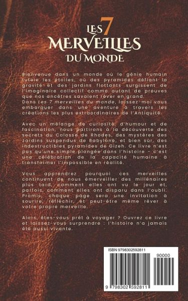 Découvrez les secrets des 7 merveilles du monde, un voyage fascinant à travers les chefs-d'oeuvre de la Grèce antique et de l'Antiquité. Que diriez-vous d'explorer les histoires, les légendes et les mystères qui entourent les Sept merveilles du monde ? Ce livre, écrit par Victor Delmer, vous emmène au coeur des plus grandes réalisations de l'humanité, des monuments qui continuent de captiver l'imagination des générations, même des millénaires après leur création. Un voyage au coeur de l'histoire Plongez dans l'histoire de la pyramide d'Égypte, ce géant de pierre qui défie le temps et les explications. Découvrez la grandeur des jardins suspendus de Babylone, un paradis légendaire dont les terrasses verdoyantes défiaient les lois de la nature. Laissez-vous émerveiller par le majestueux temple d'Artémis à Éphèse, un hommage spectaculaire à une déesse et à l'art de la Grèce antique. >Une exploration accessible et passionnante Conçu pour les curieux, les passionnés d'histoire, ou ceux qui souhaitent simplement découvrir les merveilles du monde sans prérequis, ce livre offre une expérience enrichissante et divertissante. Le style accessible et captivant de Victor Delmer rend les récits historiques vivants, mêlant faits, mythes et réflexions personnelles. Vous n'avez pas besoin d'être un expert pour plonger dans cet univers; il suffit d'être prêt à s'émerveiller. Pourquoi lire ce livre ? * Redécouvrez les 7 merveilles du monde, au-delà des simples faits historiques. * Apprenez des anecdotes fascinantes sur des monuments tels que la pyramide d'Égypte, le Colosse de Rhodes ou le mausolée d'Halicarnasse. * Voyagez dans le temps, des mystères de Babylone aux temples sacrés de la Grèce antique. * Ressentez l'esprit de ces civilisations qui ont osé rêver grand. Un livre pour tous Que vous soyez un jeune adulte curieux ou un lecteur aguerri cherchant à enrichir vos connaissances, Les 7 merveilles du monde est une invitation à voyager dans le temps et à admirer les trésors de l'humanité. Vous apprendrez à voir ces monuments non seulement comme des structures physiques, mais comme des symboles de créativité, de dévouement et d'ambition. Laissez-vous guider par Victor Delmer et partez à la rencontre des Sept merveilles du monde, ces joyaux qui ont façonné notre compréhension de l'histoire et notre fascination pour l'extraordinaire. Prenez votre billet pour un voyage inoubliable à travers le passé, sans quitter votre fauteuil. Ouvrez ce livre et préparez-vous à une expérience unique. Les merveilles du monde n'attendent plus que vous.