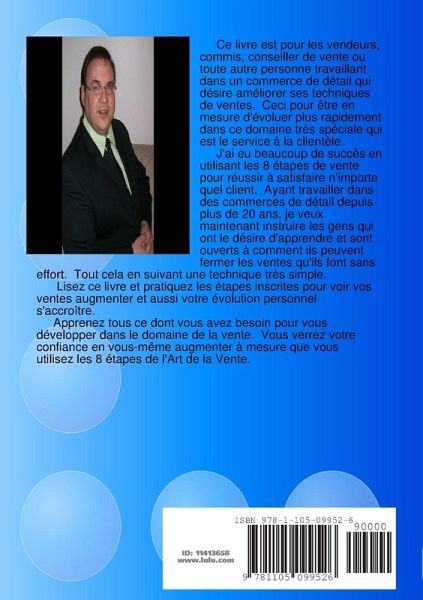 Ce livre est pour les vendeurs, commis, conseiller de vente ou toute autre personne travaillant dans un commerce de détail qui désire améliorer ses techniques de ventes pour être en mesure d'évoluer plus rapidement dans ce domaine très spéciale qui est le service à la clientèle.Vous aurez beaucoup de succès en utilisant les 8 étapes de vente pour réussir à satisfaire n'importe quel client. Voyez vos ventes augmenter et aussi votre évolution personnel s'accroître. Apprenez tous ce dont vous avez besoin pour vous développer dans le domaine de la vente. Vous verez votre confiance en vous-même augmenter à mesure que vous utiliser les 8 étapes de l'Art de la Vente.