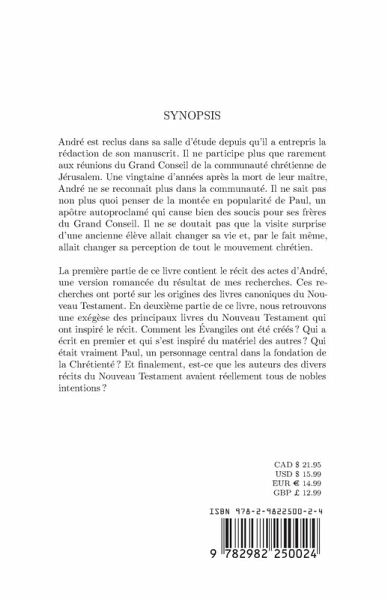 Vous êtes-vous déjà demandé comment le Nouveau Testament a vu le jour ? Qui sont les auteurs de tous ces livres ? Dans cette histoire, nous suivons l'un des apôtres les moins connus, André, qui navigue entre les politiques et les intrigues des nouvelles communautés chrétiennes. Les Actes d'André est un regard introspectif sur le sens des traditions chrétiennes et donne la parole aux sceptiques de la Bible. Pour les esprits curieux, l'histoire d'André aborde les passages difficiles de la Bible et jette un regard neuf sur l'histoire du christianisme. Synopsis André est reclus dans sa salle d'étude depuis qu'il a entrepris la rédaction de son manuscrit. Il ne participe plus que rarement aux réunions du Grand Conseil de la communauté chrétienne de Jérusalem. Une vingtaine d'années après la mort de leur maître, André ne se reconnaît plus dans la communauté. Il ne sait pas non plus quoi penser de la montée en popularité de Paul, un apôtre autoproclamé qui cause bien des soucis pour ses frères du Grand Conseil. Il ne se doutait pas que la visite surprise d'une ancienne élève allait changer sa vie et, par le fait même, allait changer sa perception de tout le mouvement chrétien. La première partie de ce livre contient le récit des actes d'André, une version romancée du résultat de mes recherches. Ces recherches ont porté sur les origines des livres canoniques du Nouveau Testament. En deuxième partie de ce livre, nous retrouvons une exégèse des principaux livres du Nouveau Testament qui ont inspiré le récit. Comment les Évangiles ont été créés ? Qui a écrit en premier et qui s'est inspiré du matériel des autres ? Qui était vraiment Paul, un personnage central dans la fondation de la Chrétienté ? Et finalement, est-ce que les auteurs des divers récits du Nouveau Testament avaient réellement tous de nobles intentions ?