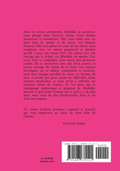 Dans ce roman sentimental, Mathilde, la narratrice, nous plonge dans l'univers intime d'une femme amoureuse et tourmentée. Elle nous relate avec ses mots faits de poésie et de prose, son histoire d'amour. Elle nous glisse au c¿ur de ses émois, nous transporte avec cet amour passionnel et charnel, qu'elle a pour son amant Eric. Cet amour sera vite rattrapé par la réalité, car Mathilde est mariée, Eric aussi. Tout se complique. Leur union doit demeurer cachée. Ils se retrouvent dans des lieux secrets, la nature sauvage des bords de la Loire. Ces amours bucoliques, où se mêlent romantisme et érotisme, nous font voyager par-delà les mots. Le lyrisme du récit, n'occulte pas pour autant les difficultés d'une relation clandestine, et nous invite à réfléchir sur l'essence même de l'amour. Et l'on peut, par ce témoignage authentique et poignant de Mathilde, mesurer à quel point l'amour est ce qu'il y a de plus beau, mais aussi de plus bouleversant, dans la vie d'un être humain.