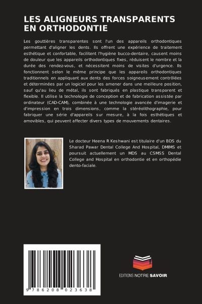 Les gouttières transparentes sont l'un des appareils orthodontiques permettant d'aligner les dents. Ils offrent une expérience de traitement esthétique et confortable, facilitent l'hygiène bucco-dentaire, causent moins de douleur que les appareils orthodontiques fixes, réduisent le nombre et la durée des rendez-vous, et nécessitent moins de visites d'urgence. Ils fonctionnent selon le même principe que les appareils orthodontiques traditionnels en appliquant aux dents des forces soigneusement contrôlées et déterminées par un logiciel pour les amener dans une meilleure position, sauf qu'au lieu de métal, ils sont fabriqués en plastique transparent et flexible. Il utilise la technologie de conception et de fabrication assistée par ordinateur (CAD-CAM), combinée à une technologie avancée d'imagerie et d'impression en trois dimensions, comme la stéréolithographie, pour fabriquer une série d'appareils sur mesure, à la fois esthétiques et amovibles, qui peuvent affecter divers types de mouvements dentaires.