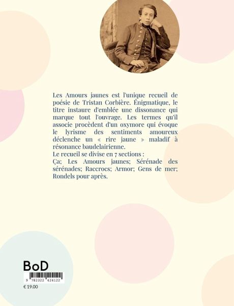 Tristan Corbière, né le 18 juillet 1845 à Ploujean et mort le 1er mars 1875 à Morlaix, est un poète français, proche du symbolisme, figure du « poète maudit ». Les Amours jaunes est l'unique recueil de poésie de Tristan Corbière. Énigmatique, le titre instaure d'emblée une dissonance qui marque tout l'ouvrage. Les termes qu'il associe procèdent d'un oxymore qui évoque le lyrisme des sentiments amoureux déclenche un « rire jaune » maladif à résonance baudelairienne.Le recueil se divise en 7 sections :Ça; Les Amours jaunes; Sérénade des sérénades; Raccrocs; Armor; Gens de mer; Rondels pour après.