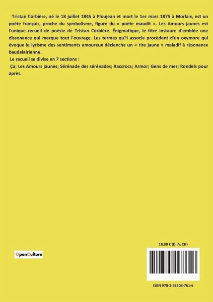 Tristan Corbière, né le 18 juillet 1845 à Ploujean et mort le 1er mars 1875 à Morlaix, est un poète français, proche du symbolisme, figure du « poète maudit ». Les Amours jaunes est l'unique recueil de poésie de Tristan Corbière. Énigmatique, le titre instaure d'emblée une dissonance qui marque tout l'ouvrage. Les termes qu'il associe procèdent d'un oxymore qui évoque le lyrisme des sentiments amoureux déclenche un « rire jaune » maladif à résonance baudelairienne. Le recueil se divise en 7 sections : Ça; Les Amours jaunes; Sérénade des sérénades; Raccrocs; Armor; Gens de mer; Rondels pour après.