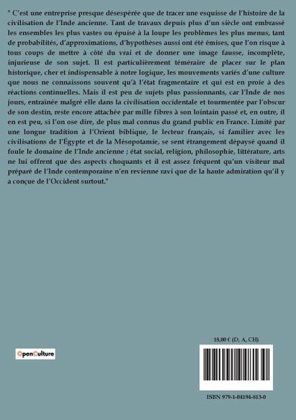 " C¿est une entreprise presque désespérée que de tracer une esquisse de l¿histoire de la civilisation de l¿Inde ancienne. Tant de travaux depuis plus d¿un siècle ont embrassé les ensembles les plus vastes ou épuisé à la loupe les problèmes les plus menus, tant de probabilités, d¿approximations, d¿hypothèses aussi ont été émises, que l¿on risque à tous coups de mettre à côté du vrai et de donner une image fausse, incomplète, injurieuse de son sujet. Il est particulièrement téméraire de placer sur le plan historique, cher et indispensable à notre logique, les mouvements variés d¿une culture que nous ne connaissons souvent qüà l¿état fragmentaire et qui est en proie à des réactions continuelles. Mais il est peu de sujets plus passionnants, car l¿Inde de nos jours, entraînée malgré elle dans la civilisation occidentale et tourmentée par l¿obscur de son destin, reste encore attachée par mille fibres à son lointain passé et, en outre, il en est peu, si l¿on ose dire, de plus mal connus du grand public en France. Limité par une longue tradition à l¿Orient biblique, le lecteur français, si familier avec les civilisations de l¿Égypte et de la Mésopotamie, se sent étrangement dépaysé quand il foule le domaine de l¿Inde ancienne ; état social, religion, philosophie, littérature, arts ne lui offrent que des aspects choquants et il est assez fréquent qüun visiteur mal préparé de l¿Inde contemporaine n¿en revienne ravi que de la haute admiration qüil y a conçue de l¿Occident surtout."