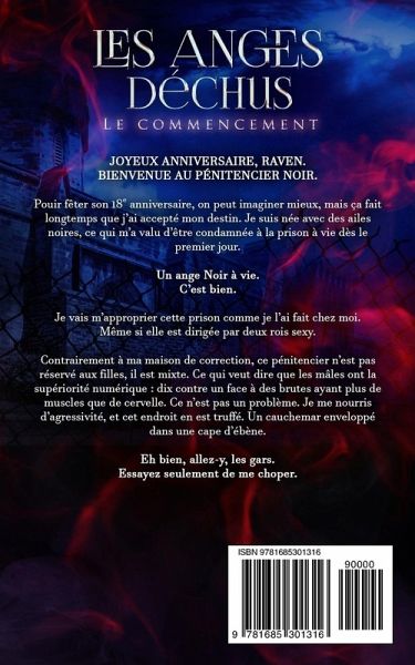 Joyeux anniversaire, Raven. Bienvenue au pénitencier Noir. Pouir fêter son 18e anniversaire, on peut imaginer mieux, mais ça fait longtemps que j'ai accepté mon destin. Je suis née avec des ailes noires, ce qui m'a valu d'être condamnée à la prison à vie dès le premier jour. Un ange Noir à vie. C'est bien. Je vais m'approprier cette prison comme je l'ai fait chez moi. >Contrairement à ma maison de correction, ce pénitencier n'est pas réservé aux filles, il est mixte. Ce qui veut dire que les mâles ont la supériorité numérique: dix contre un face à des brutes ayant plus de muscles que de cervelle. Ce n'est pas un problème. Je me nourris d'agressivité, et cet endroit en est truffé. Un cauchemar enveloppé dans une cape d'ébène. Eh bien, allez-y, les gars. Essayez seulement de me choper. Note: Cette romance MMF autonome fait partie de la collection Paranormal Prison et marque le début d'une toute nouvelle série MMF par les auteures à succès d'USA Today Lexi C. Foss & J.R. Thorn (alias Jennifer Thorn). Ordre de lecture suggéré Les Anges déchus: le commencement (une préquelle indépendante dans l'univers des Anges déchus) Les Anges déchus - livre 2: la princesse bannie Les Anges déchus - livre 3: le roi de la prison Les Anges déchus - livre 4: le prince Noir Les Anges déchus - livre 5 (titre à venir) Les Anges déchus - livre 6 (titre à venir) Les Anges déchus - livre 7 (titre à venir)