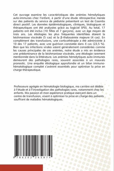 Cet ouvrage examine les caractéristiques des anémies hémolytiques auto-immunes chez l'enfant, à partir d'une étude rétrospective menée sur des patients du service de pédiatrie présentant un test de Coombs direct positif. Les données épidémiologiques, cliniques, biologiques et thérapeutiques ont été analysées grâce au logiciel SPSS. Au total, 17 patients ont été inclus (10 filles et 7 garçons), avec un âge moyen de trois ans. Les étiologies les plus fréquentes identifiées étaient la leishmaniose viscérale (5 cas) et la beta-thalassémie majeure (4 cas). En complément des transfusions, une corticothérapie a été administrée à 10 des 17 patients, avec une guérison constatée dans 4 cas (23,5 %). Bien que les infections virales soient généralement considérées comme les causes principales de ces anémies, notre étude a mis en évidence une prédominance de la leishmaniose viscérale, une étiologie rarement mentionnée dans la littérature. Les anémies hémolytiques auto-immunes demeurent des pathologies rares, souvent associées à un mauvais pronostic. Une enquête étiologique approfondie et un bilan immuno-hématologique complet s'avèrent essentiels pour optimiser la prise en charge thérapeutique.