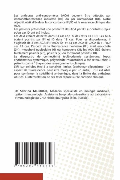 Les anticorps anti-centromères (ACA) peuvent être détectés par immunofluorescence indirecte (IFI) ou par immunodot (ID). Notre objectif était d'évaluer la concordance IFI/ID et la relevance clinique des ACA.Les patients présentant une positivité des ACA par IFI sur cellules Hep-2 et/ou par ID ont été inclus. Les ACA étaient détectés dans 63 cas (2,1 % des tests IFI+ID). Les ACA étaient positifs par IFI et ID dans 18 cas. Pour les discordances, il s'agissait de 2 cas ACA-IFI+/ACA-ID- et 43 cas ACA-IFI-/ACA-ID+. Pour ces 43 cas, l'aspect de la fluorescence nucléaire (IFI) était moucheté (34), moucheté nucléolaire (6) ou homogène (3); les ACA (ID) étaient faiblement positifs (26), positifs (7) ou fortement positifs (10).Le diagnostic de connectivité (sclérodermie systémique, lupus érythémateux systémique, polyarthrite rhumatoïde) a été retenu chez 3 patients parmi 18 ayant des renseignements cliniques. L'IFI sur cellules Hep-2 a certaines limites (opérateur-dépendante ; un aspect de fluorescence peut être masqué par un autre). L'ID est utile pour confirmer la spécificité antigénique, dans la limite des antigènes utilisés. L'interprétation de ces tests repose sur le contexte clinique.