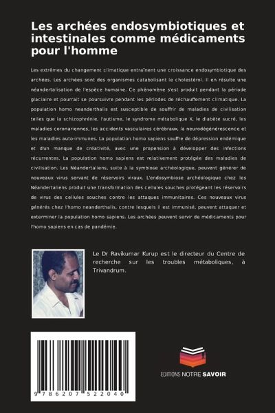 Les extrêmes du changement climatique entraînent une croissance endosymbiotique des archées. Les archées sont des organismes catabolisant le cholestérol. Il en résulte une néandertalisation de l'espèce humaine. Ce phénomène s'est produit pendant la période glaciaire et pourrait se poursuivre pendant les périodes de réchauffement climatique. La population homo neanderthalis est susceptible de souffrir de maladies de civilisation telles que la schizophrénie, l'autisme, le syndrome métabolique X, le diabète sucré, les maladies coronariennes, les accidents vasculaires cérébraux, la neurodégénérescence et les maladies auto-immunes. La population homo sapiens souffre de dépression endémique et d'un manque de créativité, avec une propension à développer des infections récurrentes. La population homo sapiens est relativement protégée des maladies de civilisation. Les Néandertaliens, suite à la symbiose archéologique, peuvent générer de nouveaux virus servant de réservoirs viraux. L'endosymbiose archéologique chez les Néandertaliens produit une transformation des cellules souches protégeant les réservoirs de virus des cellules souches contre les attaques immunitaires. Ces nouveaux virus générés chez l'homo neanderthalis, contre lesquels il est immunisé, peuvent attaquer et exterminer la population homo sapiens. Les archées peuvent servir de médicaments pour l'homo sapiens en cas de pandémie.
