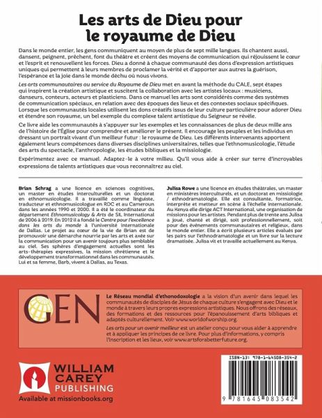 Les arts de Dieu pour le royaume de Dieu Dans le monde entier, les gens communiquent au moyen de plus de sept mille langues. Ils chantent aussi, dansent, peignent, prêchent, font du théâtre et créent des moyens de communication qui réjouissent le c¿ur et l'esprit et renouvellent les forces. Dieu a donné à chaque communauté des dons d'expression artistiques uniques qui permettent à leurs membres de proclamer la vérité et d'apporter aux autres la guérison, l'espérance et la joie dans le monde déchu où nous vivons. Les arts communautaires au service du Royaume de Dieu met en avant la méthode du CALE, sept étapes qui inspirent la création artistique et suscitent la collaboration avec les artistes locaux : musiciens, danseurs, conteurs, acteurs et plasticiens. Dans ce manuel les arts sont considérés comme des systèmes de communication spéciaux, en relation avec des époques des lieux et des contextes sociaux spécifiques. Lorsque les communautés locales utilisent les dons créatifs issus de leur culture particulière pour adorer Dieu et étendre son royaume, un bel exemple du complexe talent artistique du Seigneur se révèle. Ce livre aide les communautés à s'appuyer sur les exemples et les connaissances de plus de deux mille ans de l'histoire de l'Église pour comprendre et améliorer le présent. Il encourage les peuples et les individus en dressant un portrait vivant d'un meilleur futur : le royaume de Dieu. Les différents intervenants apportent également leurs compétences dans diverses disciplines universitaires, telles que l'ethnomusicologie, l'étude des arts du spectacle, l'anthropologie, les études bibliques et la missiologie. Expérimentez avec ce manuel. Adaptez-le à votre milieu. Qu'il vous aide à créer sur terre d'incroyables expressions de talents artistiques que vous reconnaîtrez au ciel.