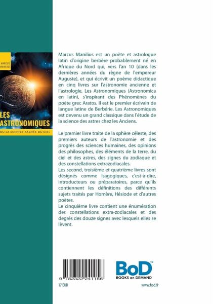 Marcus Manilius est un poète et astrologue latin d'origine berbère probablement né en Afrique du Nord qui, vers l'an 10 (dans les dernières années du règne de l'empereur Auguste), et qui écrivit un poème didactique en cinq livres sur l'astronomie ancienne et l'astrologie, Les Astronomiques (Astronomica en latin), s'inspirant des Phénomènes du poète grec Aratos. Il est le premier écrivain de langue latine de Berbérie. Les Astronomiques est devenu un grand classique dans l'étude de la science des astres chez les Anciens.Le premier livre traite de la sphère céleste, des premiers auteurs de l'astronomie et des progrès des sciences humaines, des opinions des philosophes, des éléments de la terre, du ciel et des astres, des signes du zodiaque et des constellations extrazodiacales.Les second, troisième et quatrième livres sont désignés comme Isagogiques, c'est-à-dire, introducteurs ou préparatoires, parce qu'ils contiennent les définitions des différents sujets traités par Homère, Hésiode et d'autres poètes.Le cinquième livre contient une énumération des constellations extra-zodiacales et des degrés des douze signes avec lesquels elles se lèvent.Tels sont donc les objets traités par Manilius dans les cinq livres de ses Astronomiques. Il s'était proposé d'en traiter beaucoup d'autres; mais la mort ne lui en a pas probablement laissé le temps.La présente édition est illustrée d'une suite complète des gravures du Livre des fables astronomiques de C. Julius Hyginus, selon l'édition de 1578.