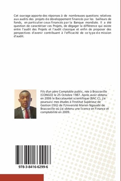 Cet ouvrage apporte des réponses à de nombreuses questions relatives aux audits des projets de développement financés par les bailleurs de fonds, en particulier ceux financés par la Banque mondiale. Il a été question de caractériser ces Projets, de dégager la différence qui existe entre l'audit des Projets et l'audit classique et enfin de proposer des perspectives d'avenir contribuant à l'efficacité de ce type de mission d'audit.