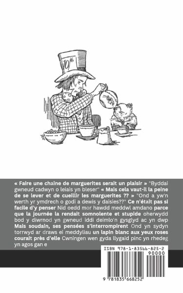 Faire une chaîne de marguerites serait un plaisir "Byddai gwneud cadwyn o leiais yn bleser" Mais cela vaut-il la peine de se lever et de cueillir les marguerites "Ond a yw'n werth yr ymdrech o godi a dewis y daisies " Ce n'était pas si facile d'y penser Nid oedd mor hawdd meddwl amdano parce que la journée la rendait somnolente et stupide oherwydd bod y diwrnod yn gwneud iddi deimlo'n gysglyd ac yn dwp Mais soudain, ses pensées s'interrompirent Ond yn sydyn torrwyd ar draws ei meddyliau un lapin blanc aux yeux roses courait près d'elle Cwningen wen gyda llygaid pinc yn rhedeg yn agos gan ei Il n'y avait rien de trop remarquable chez le lapin Doedd dim byd yn rhy ryfeddol am y gwningen et Alice ne trouvait pas non plus le lapin remarquable ac ni chredai Alice fod y gwningen yn rhyfeddol ychwaith elle ne s'étonna pas non plus quand le Lapin parla Ni wnaeth ychwaith ei synnu pan siaradodd y Gwningen Oh mon Dieu ! Je serai trop tard ! se dit-il "Oh dear! Mi fydd hi'n rhy hwyr!" meddai wrtho'i hun mais alors le Lapin a fait quelque chose que les lapins n'ont pas fait ond yna gwnaeth y Gwningen rywbeth nad oedd cwningod yn ei wneud le Lapin tira une montre de la poche de son gilet cymerodd y Gwningen wyliadwriaeth allan o'i boced gwasg Il regarda l'heure puis se hâta Edrychodd ar y pryd ac yna rhuthro ymlaen